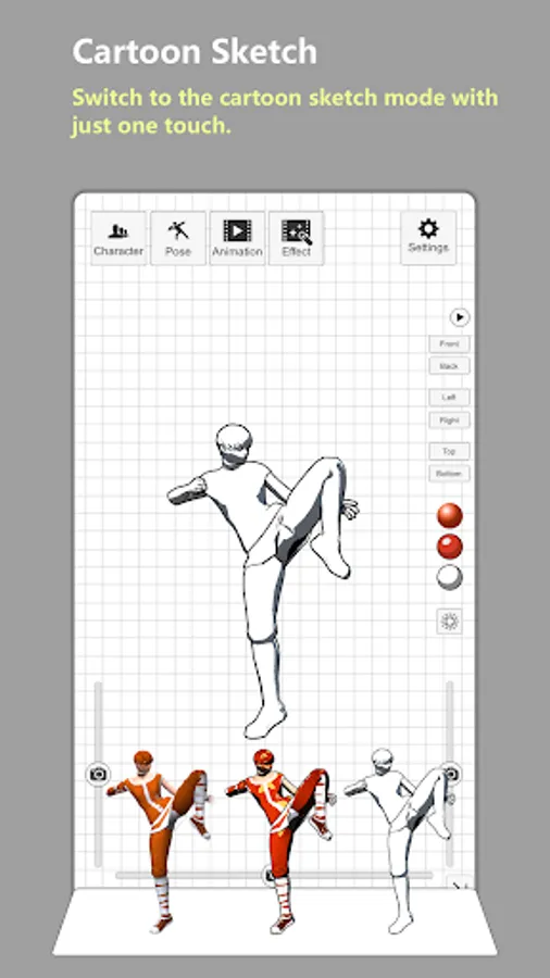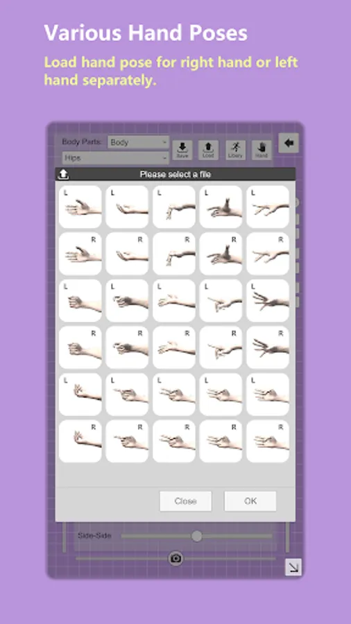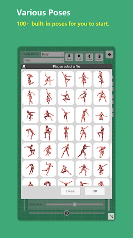 You may simply load a pose from the pose library. And you may also get many poses from the animations. At present this app has 145 animations, 100+ body poses and 30 hand poses.