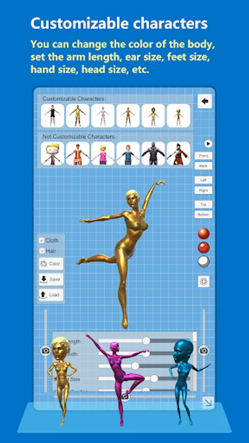 The base characters in this app are fully customizable. You can change the color of the body, set the arm length, ear size, feet size, hand size, head size, face details, etc.
