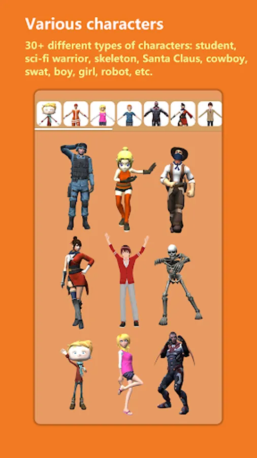 It provides 30+ different types of characters: student, sci-fi warrior, skeleton, Santa Claus, cowboy, swat, ninja, zombie, boy, girl, robot, etc.