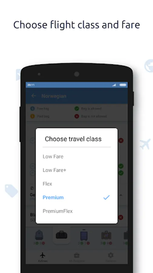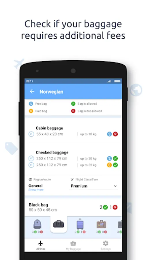 Baggify allows you to check if your baggage is suitable to take it to the aircraft cabin, whether you have to pay for your luggage dependent on the flight class/fare and how many units you will be allowed to take on board free of charge.
