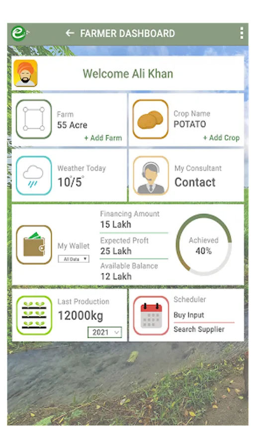 With Bagh-e, the farmer enters an Islamic Mudarabah partnership with Bagh-e. Once the farmer is approved after the initial due diligence, the farmer can apply for financing which will be in the form of digital cash in the farmers Bagh-e wallet. The digital cash can only be used at approved raw-material suppliers. Bagh-e automatically gives the financing options based on which crop is in season and the location of the field.