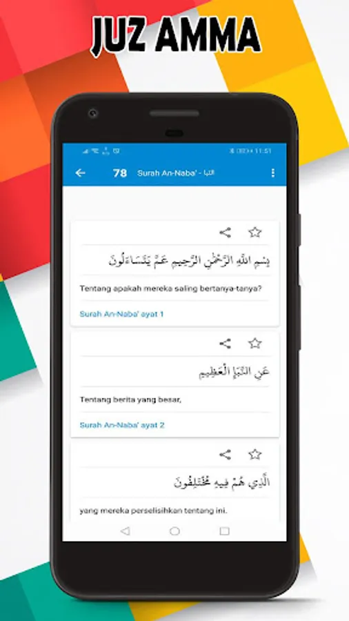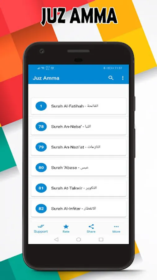 Aplikasi Juz Amma ini khusus untuk anda yang ingin belajar membaca dan menghafal Al-Quran. Juz Amma Lengkap terdiri dari surat-surat pilihan Juz ke 30 di dalam Al-Qur'an, seperti :