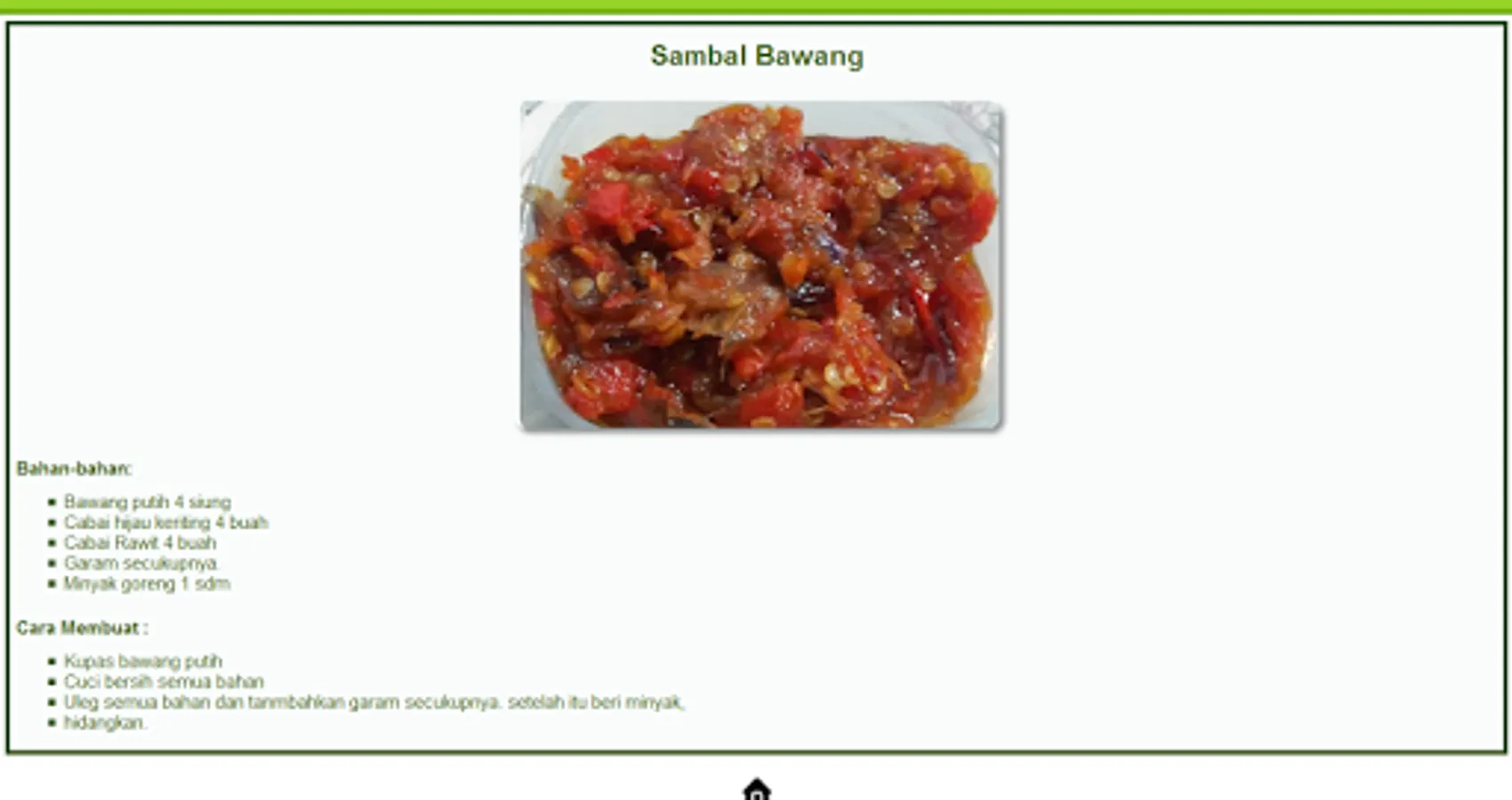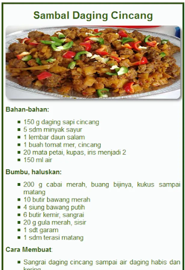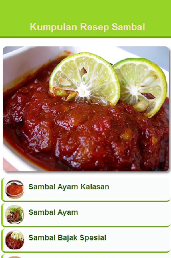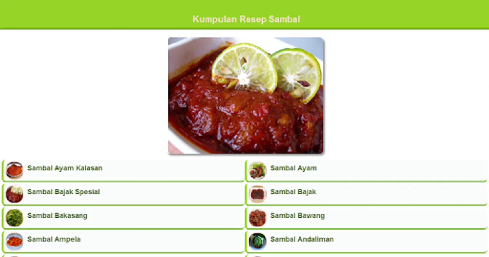 Beberapa resep yang ada di dalam aplikasi Aneka Resep Sambal Lengkap ini adalah: