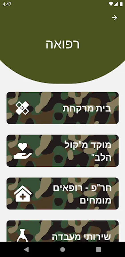 3. Medicine - Information about: The infirmary & pharmacy, The call center of the Medical Corps named "Mikol Halev" and the Harap which is outside of the base.