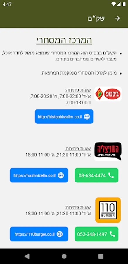 2. Shopping Center - Contact information and opening hours of all stores in the shopping center.