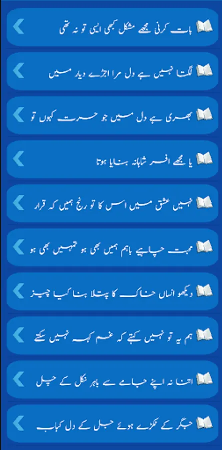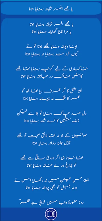 Bahadur Shah Zafar App contain the best poetry from him. This app contain fine collection of the poet with beautiful design and structure and easy to use. You can copy the ghazals, increase font size, and decrease font size and also share the content of app with your friends directly without copying it from copy button.