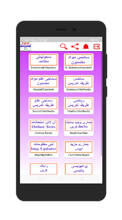In "TET Material In Urdu" App We have Added All Subject Material For Urdu Medium Students: EVS(Environmental Studies), General Science, Social Studies, Mathematics with solutions, Pedagogy/Methods of Teaching, General Knowledge, Quiz Type Question, Quiz Exams for self evaluation.