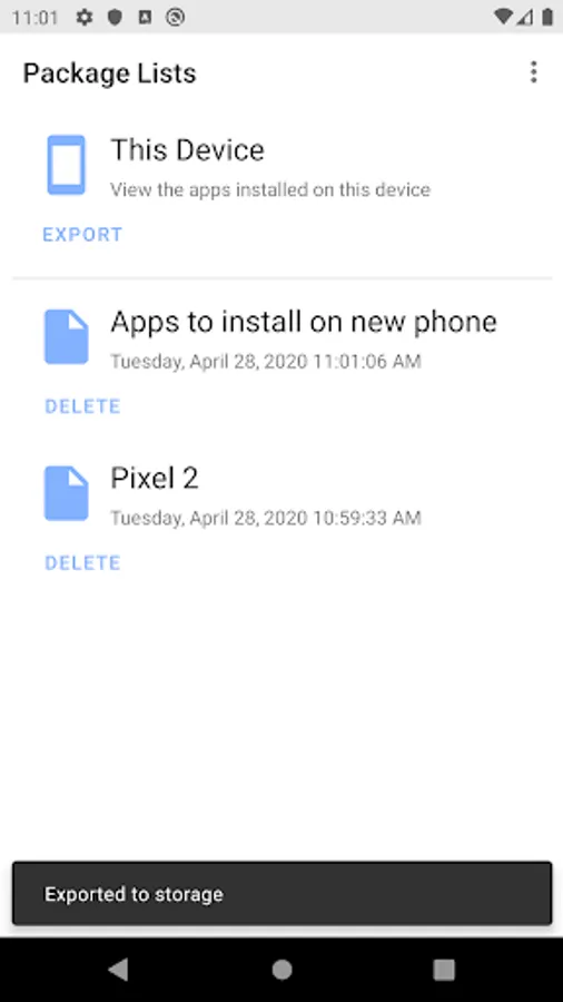 * Exporting allows you to easily save a list of your installed packages to the local storage of your device. You can easily transfer the backup file using the file manager of your choice.
