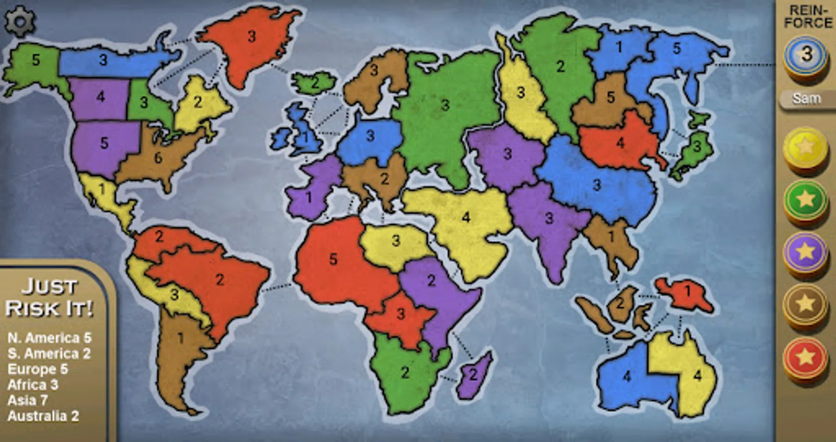 Just Risk It is a game of chance and strategy, similar to the classic board game of Risk. The goal is to gain territory by attacking your opponents, and eliminate them one-by-one. The last one remaining is the winner.