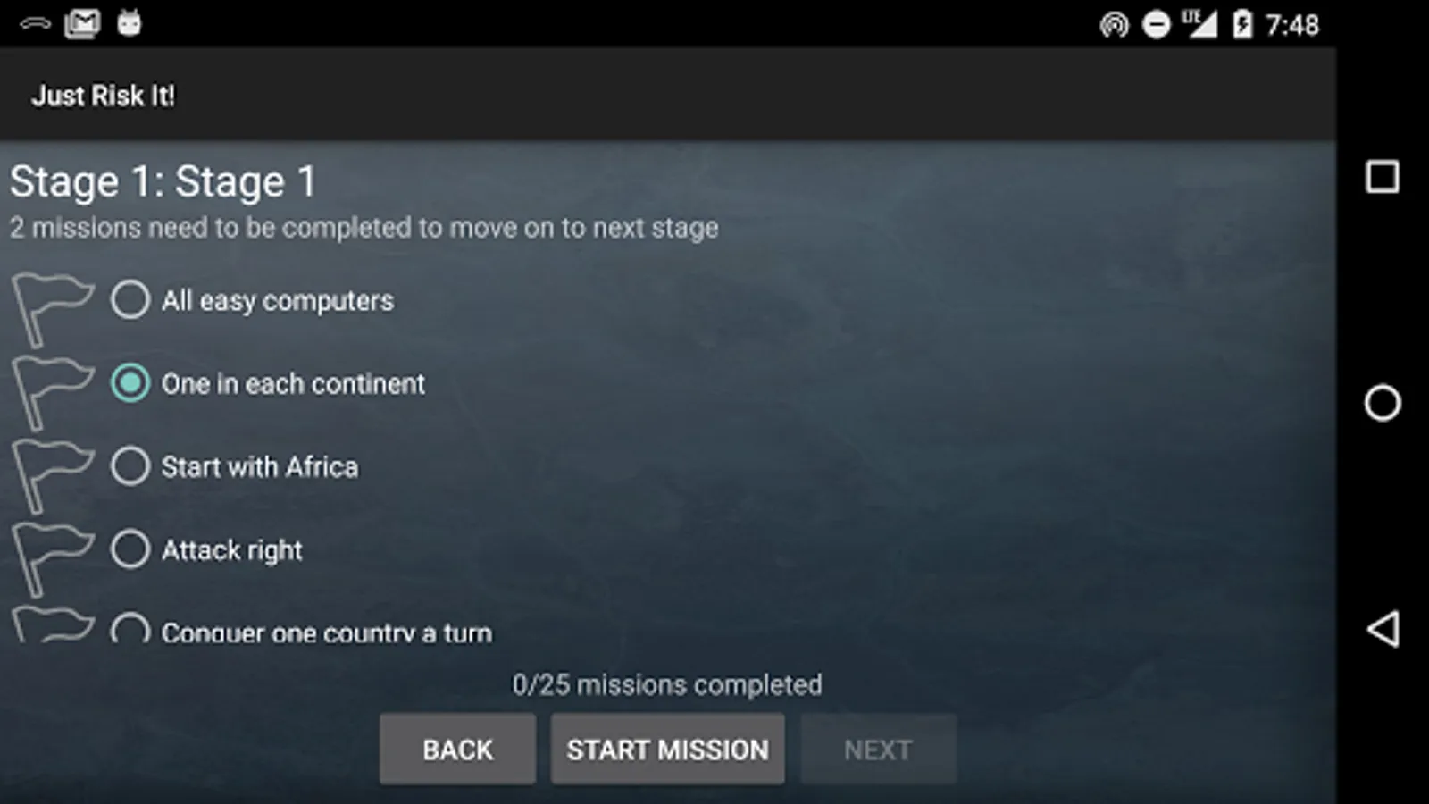The latest release includes 25 unique missions that you can play. Each mission has specific challenges and obstacles that puts a twist on regular play. For example, one mission requires you to conquer at least one country on each round. Another mission has the computers forming a loose treaty and ganging up on you.