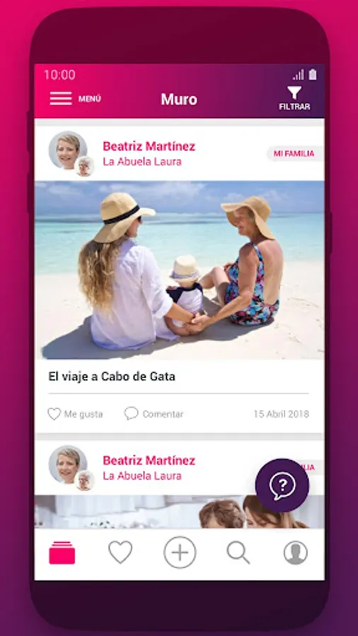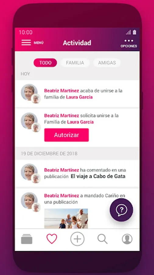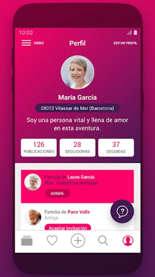 The FAMILY level is where families privately share their moments and memories in the form of publications. Caregivers can post day-to-day moments so that the whole family is aware of the state of the person cared for and the effort involved in caring. The rest of the family users can publish their day to day to help the caregivers and the caregivers to feel socially active.