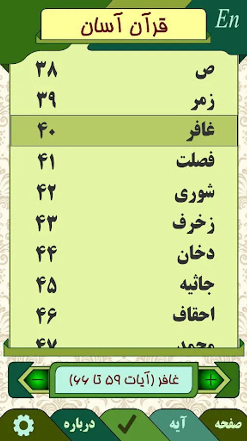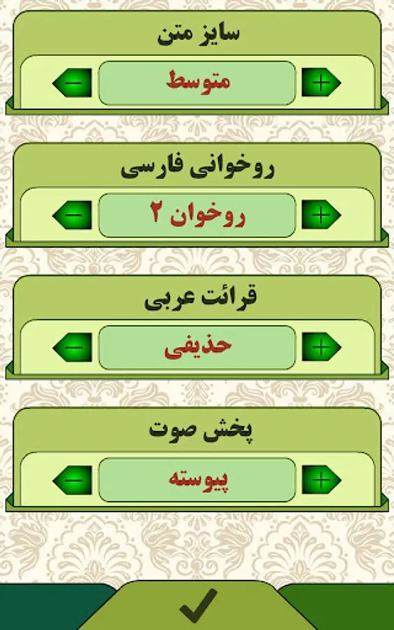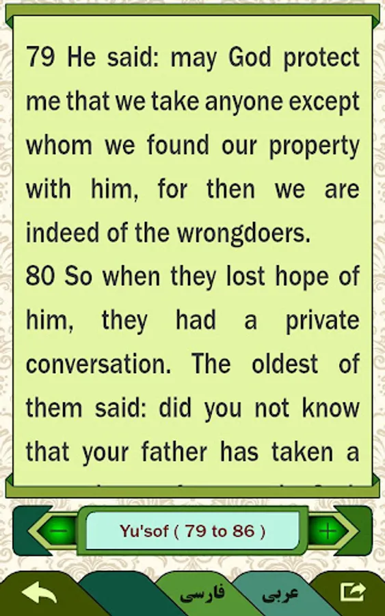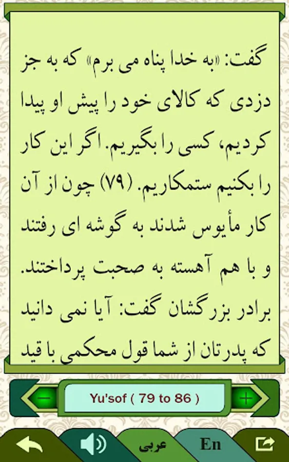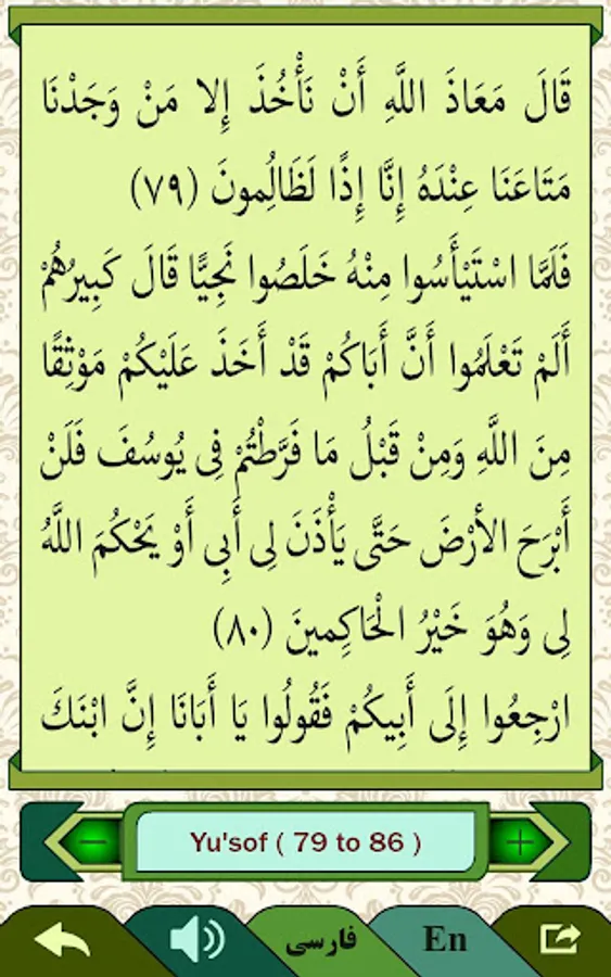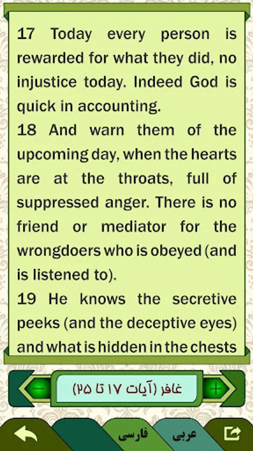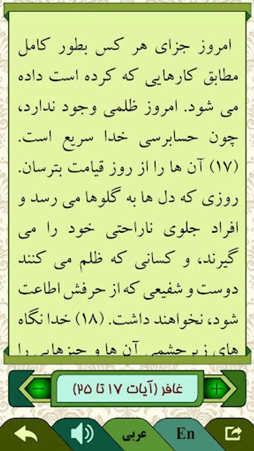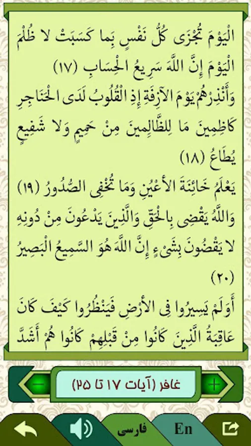 - Two Audio Narrations in Persian, and Three different Arabic Narrations (Qaris)