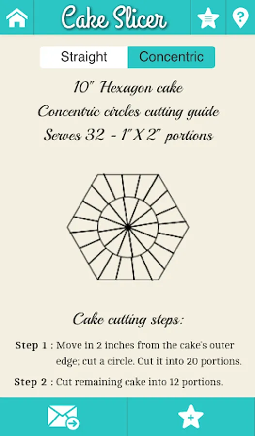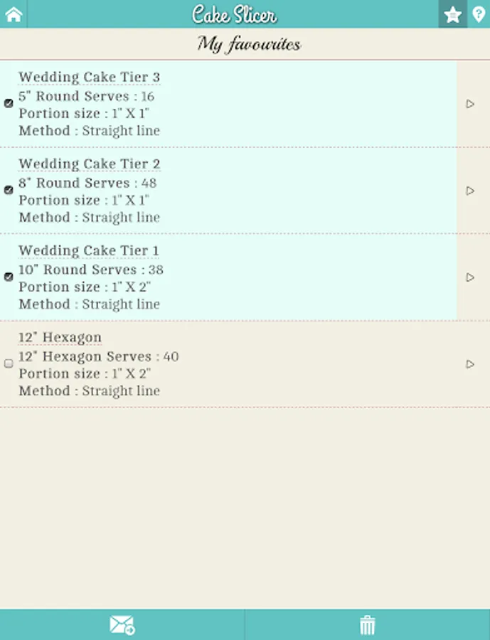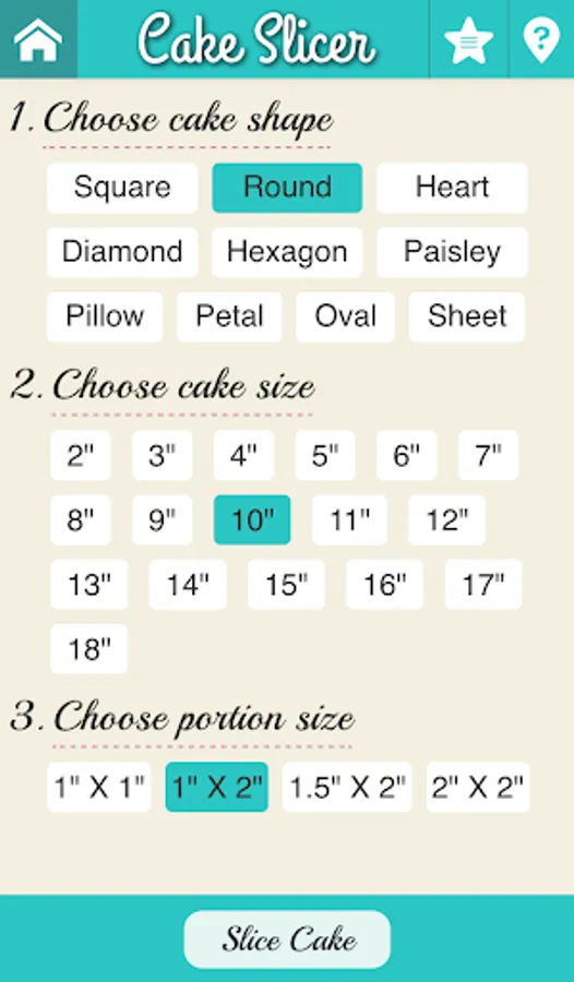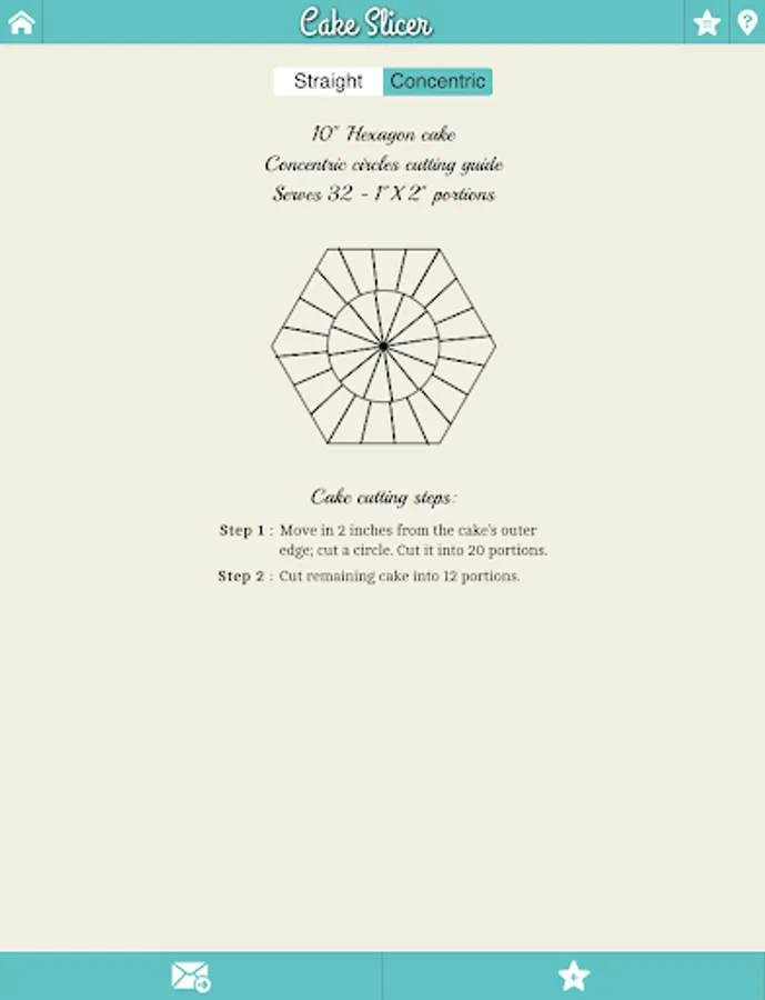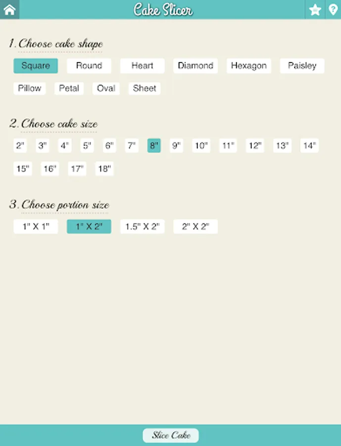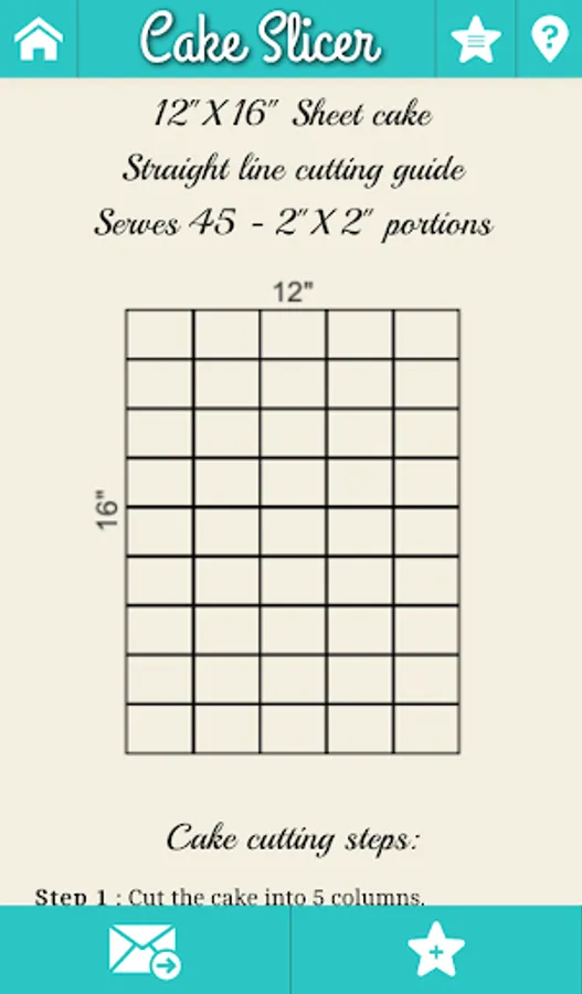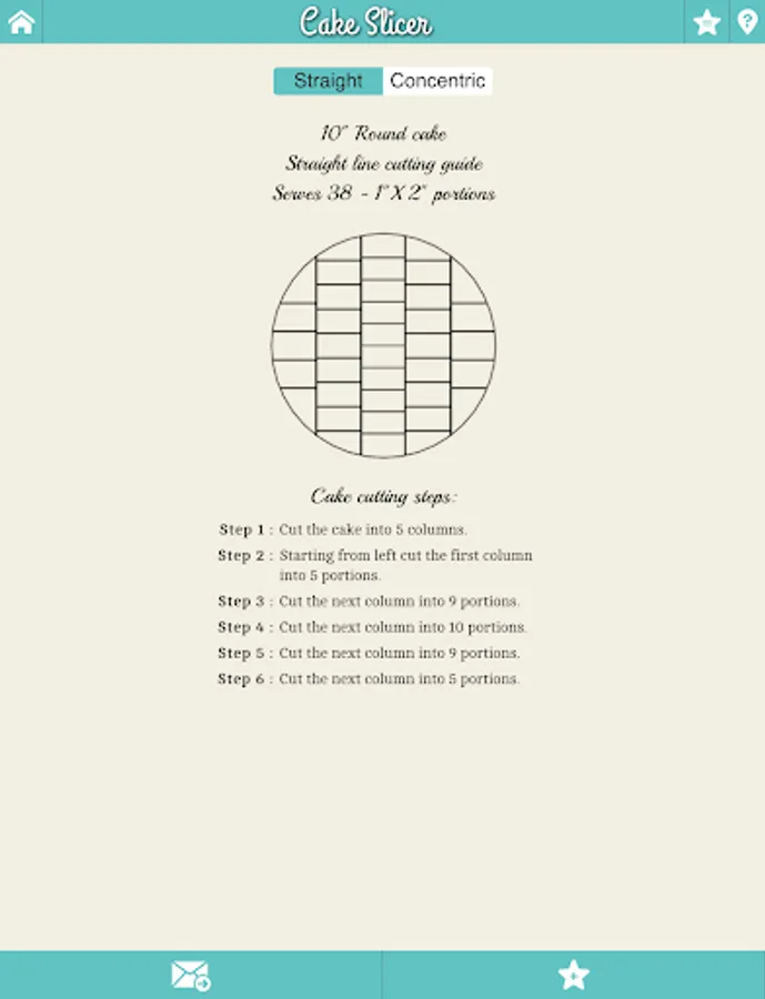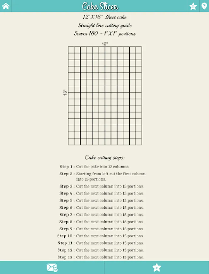 Cake Slicer is the most comprehensive guide to cutting cakes of most cake shapes and sizes into desired portion size. You can email from 412 cake cutting guides with step by step instructions from the app. No more searching the Internet to find correct cake cutting guides.