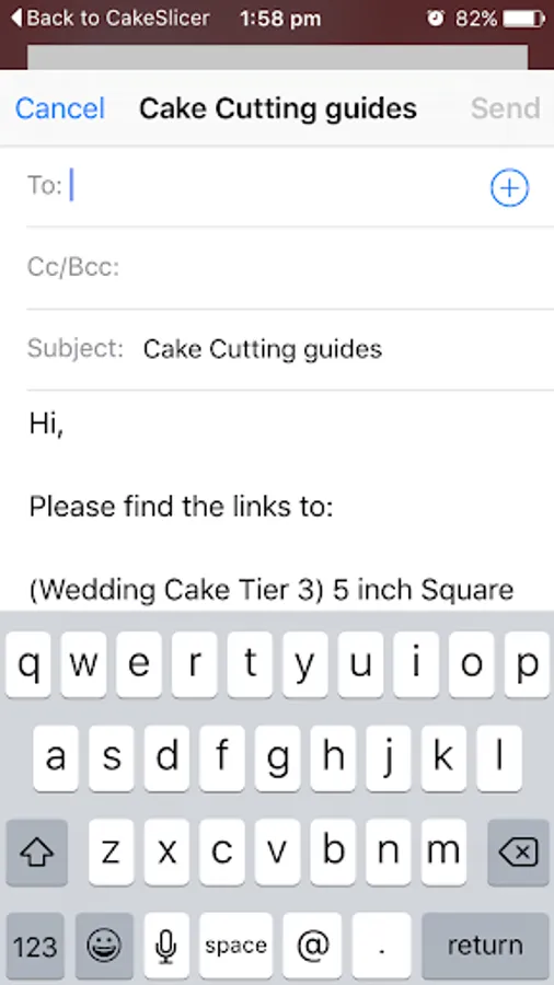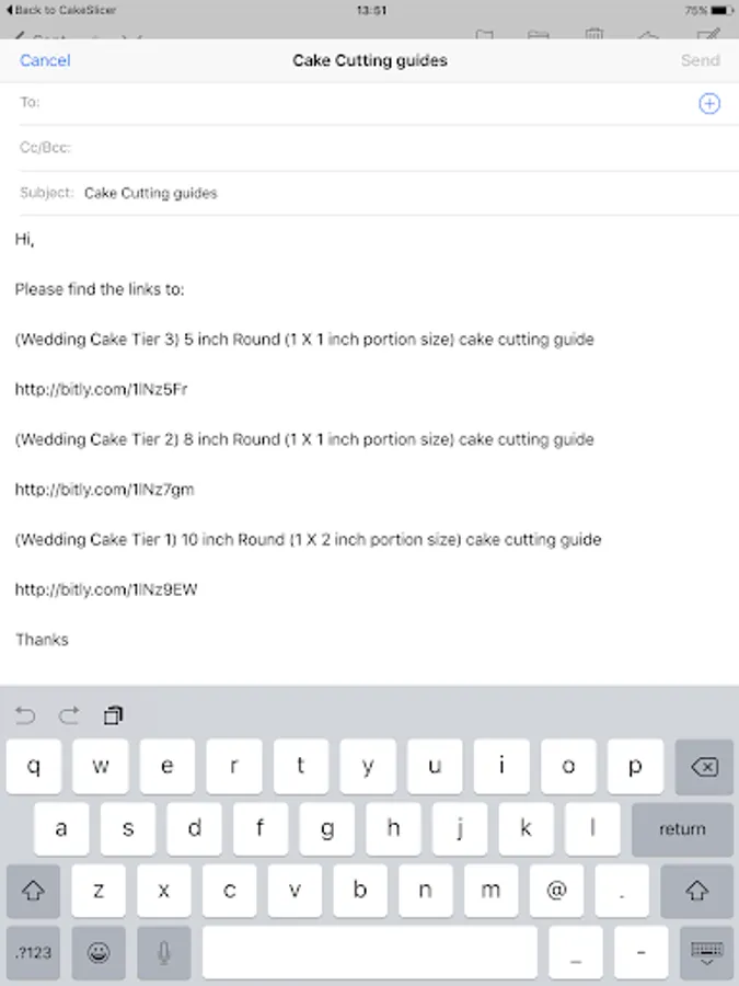 - Email one or more of the cake cutting PDFs to your client with your cake order. The email option lets you email a PDF link to your chosen guide to your customer or yourself, which can then be easily printed.
