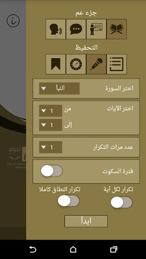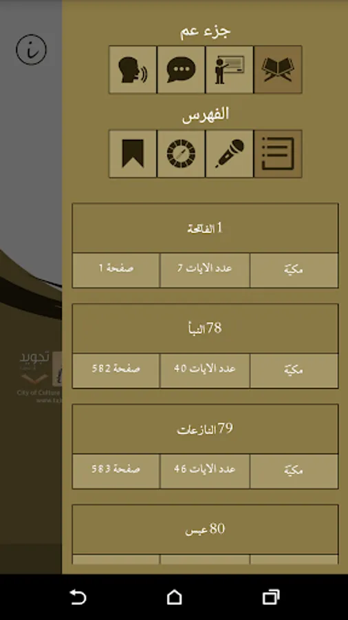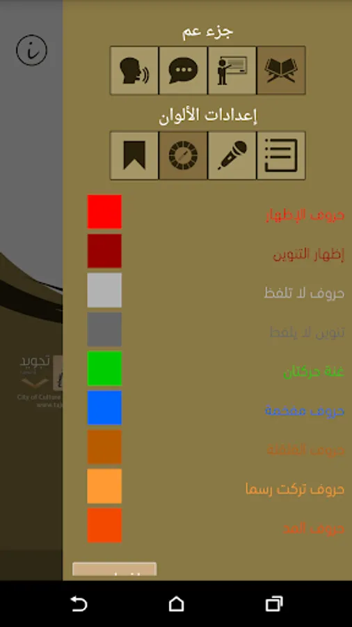 يحتوي التطبيق على عرض جزء عم ملوناً، تطبيقاً على طريقة تلاوة القرآن الكريم بأحكام تجويد القرآن الكريم من خلال استخدام الألوان بصوت القارئ الشيخ فؤاد الحسن