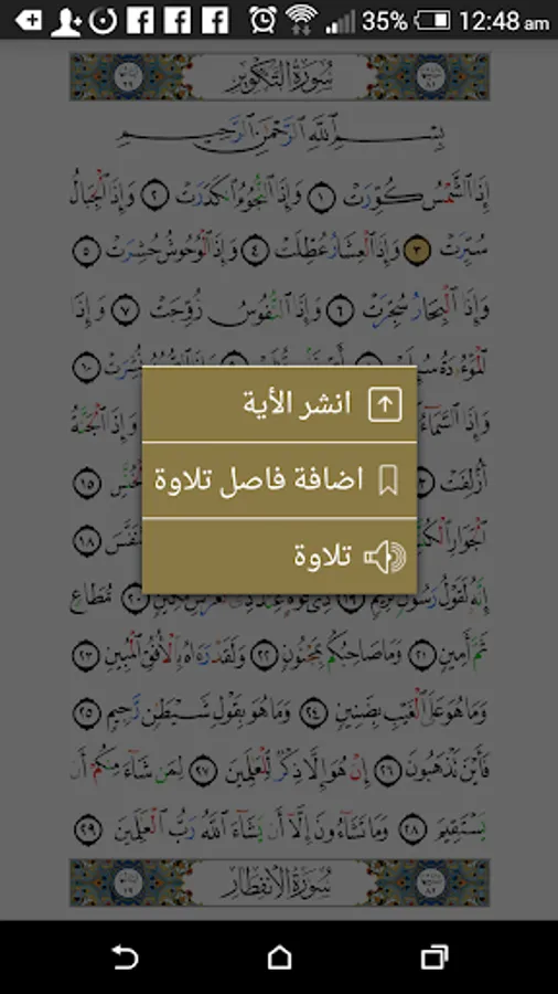 - هذا التطبيق يعمل على تسهيل التلاوة على القارئ وإن لم يكن لديه علم بأحكام تجويد القرآن الكريم من خلال استخدام الألوان، لون خاص بكل حكم.