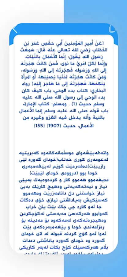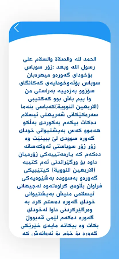 الحمد لله والصلاة والسلام على رسول الله وبعد :زۆر سوباس بۆخودای گهورهو میهرهبان سوباس بۆئهوخودایهی كهكانگای سۆزوو بهزهییه بهراستی من وا بیم باش بوو كهكتیبی (الاربعین النوویة)كهباسی بنەما سەرەکێکانی شهریعتی ئيسلام دهكات بیكهم بهكوردی بهڵكو ههموو كهس بهپشتیوانی خودای گهوره سوودی لێ ببینێت وه زۆر زۆر سوباستی ئهوكهسانه دهكهم كه یارمهتییهكی زۆرمیان داوه بۆ ورگێراندنی ئەم كتیبه (الاربعین النوویة) كیتێبیكی گهورهو بهسووده بهشێوهیهكی فراوان بڵاوهی كراوهتەوە لهجیهانی ئیسلامی منیش بهپشتیوانی خودای گهوره دهستم كرد به وهرگێركردنی داوا لهخودای گهوره دهكهم لێمی قهبووڵ بكات وه بیكاته مایهی خێرێكی گهوره بۆ خۆم بۆ ئهوانهش كه سوودی لێ دهبینن . وهئهم كتێبه پێشكهش دهكهم به دایك وباوكی خۆشهویستم كهههموو تهمهنی زێڕینی خۆیان كرده قوربانی پهروهردهكردنم ، وة پێشكهش بۆ مامۆستام وتاجی سهرم ({مامۆستا طارق ههمهوهندی}) كهبوه هۆی ڕێپیشاندان وجێگیربوونم لهسهر ئاینی پاكی خوای گهوره وەزۆر سوپاستی ئەو هاورێ بەرێزانی خۆم دەکەم کەتوانیانە هەتا ئێستا لەگەڵمدابن وەیارمەتیم بدەم لەبەردەوام بون لەژیاندا وەهەروەها زۆر زۆر سوپاسی ( دیار عبدالله روستایی ) دەکەم کەهەستا بەبەخشکردنی ئەوکارە پیرۆزە بۆیە داواکارم لەخودای گەورە زیاتر وەزیاتر خودای گەورە پایەداری بکات