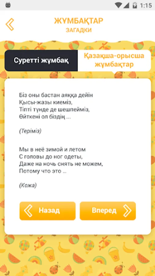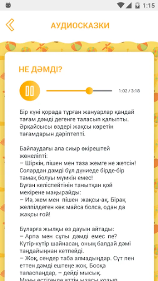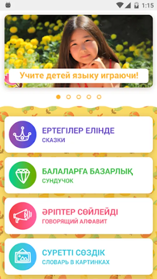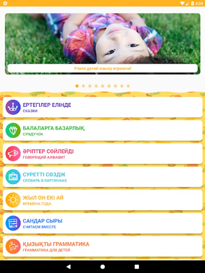 Here kids can get acquainted with the alphabet, learn new words with the help of a dictionary, learn how to count, and also learn what is good and what is bad. And in such additional sections as “Tales”, “Little Trunk” and “Cartoons” your child will be able to watch cartoons in the Kazakh language, sing songs, learn counting glasses, paint coloring books and find many more interesting activities for himself!