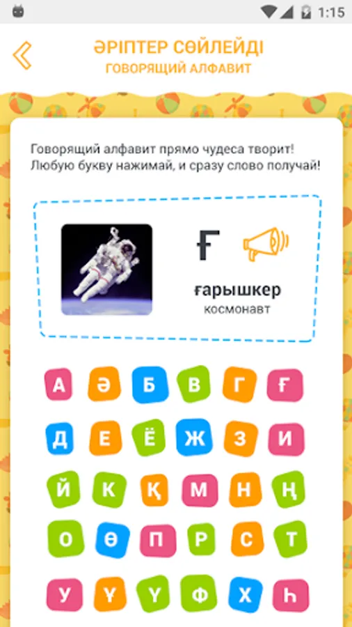 * Recognize letters - a very important skill that will serve as an excellent service when the baby starts reading. In this section of the site, children in the game form memorize the letters of the Kazakh alphabet and try to make words from the letters. Letters and words are voiced during the game, so that children are easier to remember.