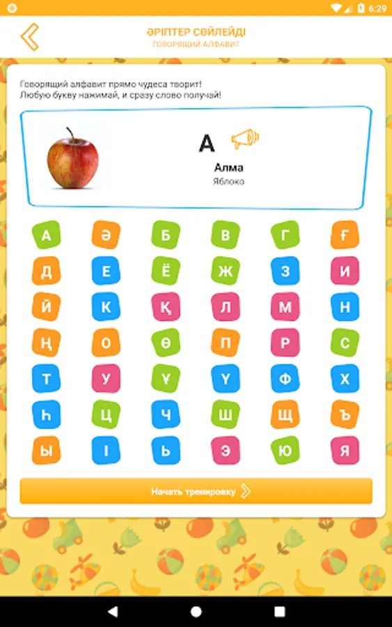Bala Soyle is an online distance learning service for children of preschool age. It is known that children love to play and they do not even need to be forced to do it. While playing, we communicate with children in their territory. Our mobile application contains educational and learning tasks, the purpose of which is to enrich the vocabulary, the formation of grammatical correct speech.