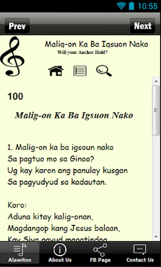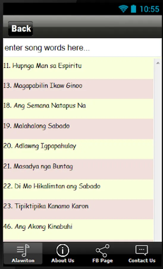 Kind Note: The App is still under development, due to difficulties of encoding in Cebuano words, typing errors are very common, kindly use the contact form to report all Songs who has this errors, or you message it in our FB Page, we will update it as soon as possible.