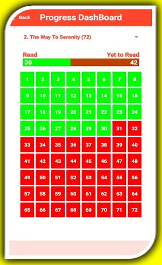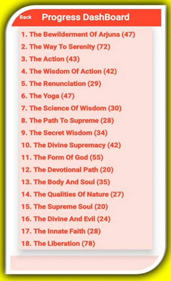 4. A complete view of what progress the user has read so far, is given. By selecting each of the chapters, users can view what Shlokas they already completed reading and what are pending to read.