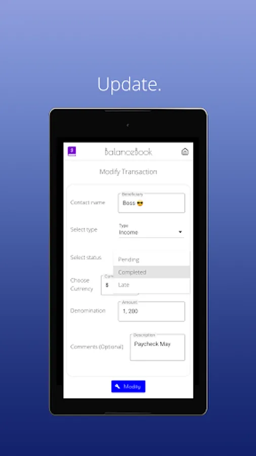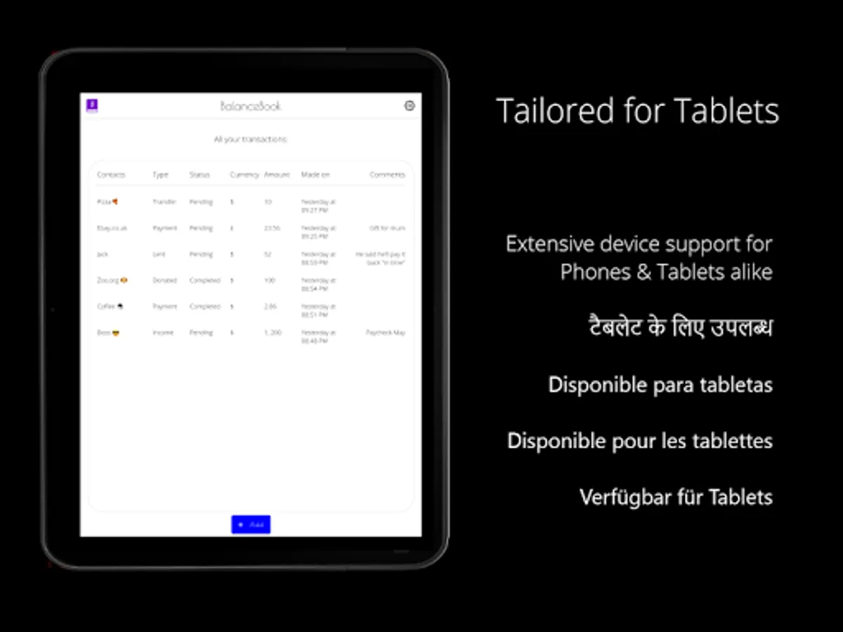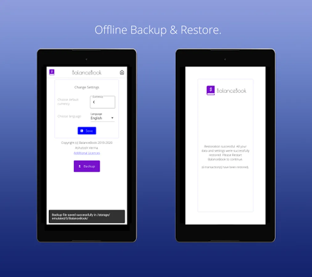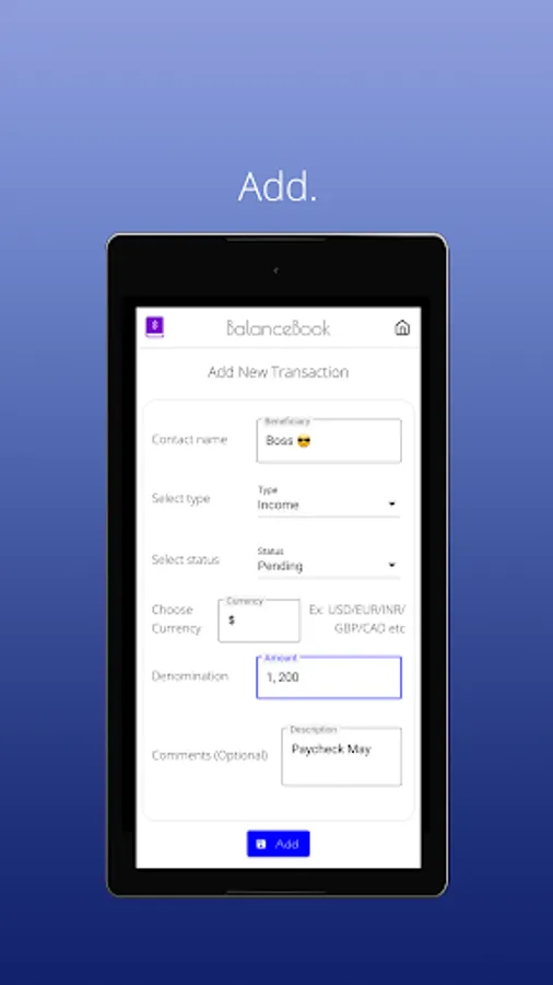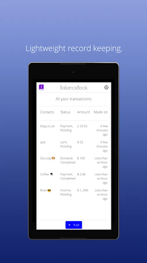 BalanceBook is an offline lightweight personal transactions manager for the busy-bees. You won't have to write notes or save memos related to your financial activity anymore. With BalanceBook you can manage all your transactions with ease. Add. Categorize. Modify. Remove. Back-up & Restore. It's really that simple.