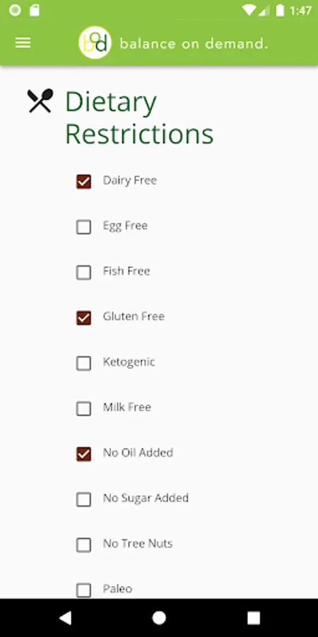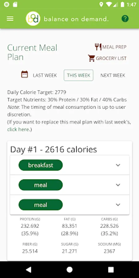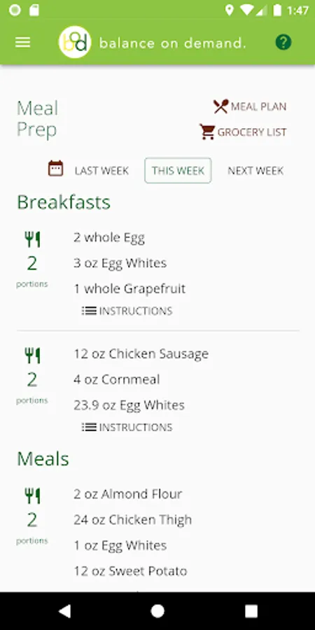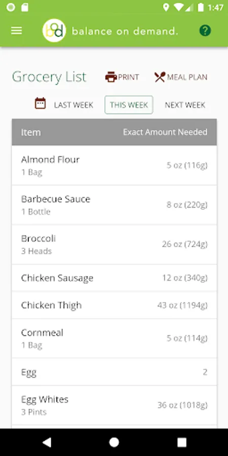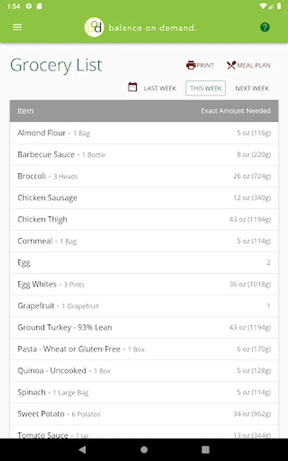 Balance on Demand helps you develop nutritious meal plans to achieve your health goals, whether that means losing some weight or adding muscle mass. After providing some information around your body metrics, lifestyle, and dietary preferences, the app calculates your daily caloric intake and macronutrient percentages that will be used to generate each week's meal plan. Then each week you'll get a new set of meals that match your profile, with as much or as little variety as you want. You can also view a grocery list of all ingredients for the week to make your shopping trip a bit more efficient, plus view a checklist of meal preparation steps if you prefer to make everything at once.