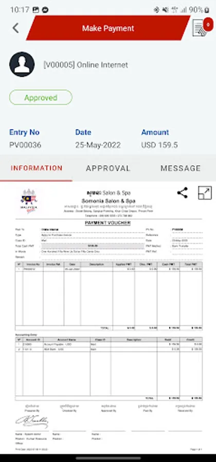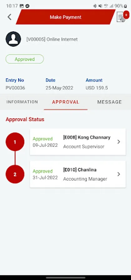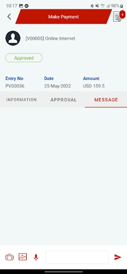 - Review at a glance header, date, transaction amount, approval status, attachments and comments/chat with requester and other approvers