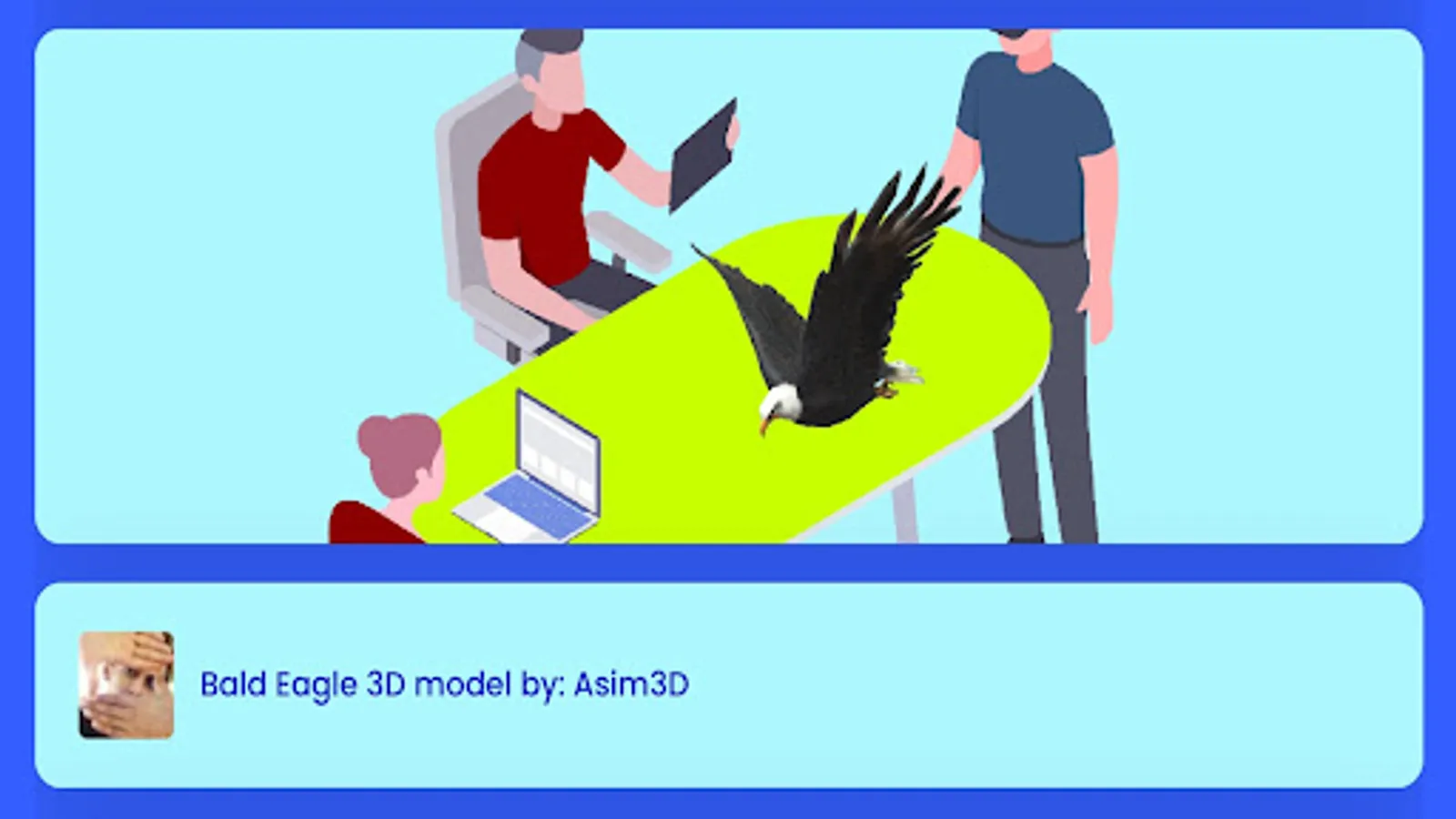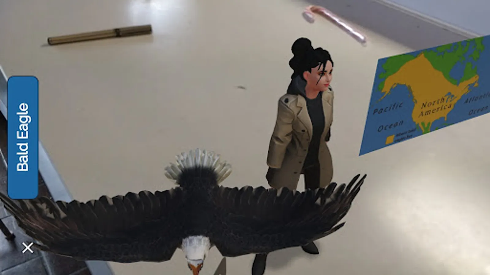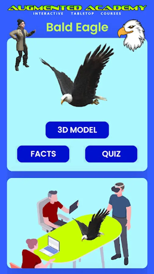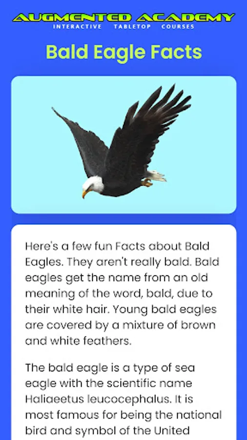 Students will love this bald eagle study course that includes a bald eagle 3D model, bald eagle facts, and a quiz to test your bald eagle knowledge. Listen to the distinct call of the bald eagle while the augmented reality host, Kara Green, tells you interesting facts about the bald eagle. View this educational augmented reality presentation right on your tabletop or desk - perfect for school settings. Augmented reality makes learning fun!