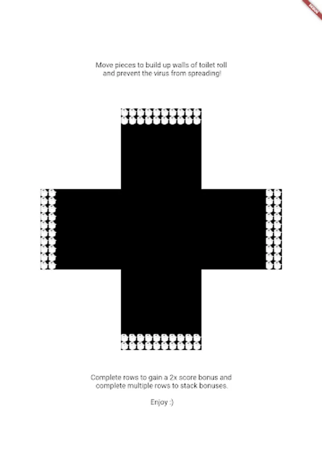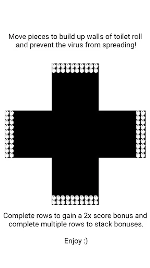 Move pieces to build up walls of toilet roll and prevent the germs from spreading! Complete rows to gain a 2x score bonus and complete multiple rows to stack bonuses. Enjoy :)