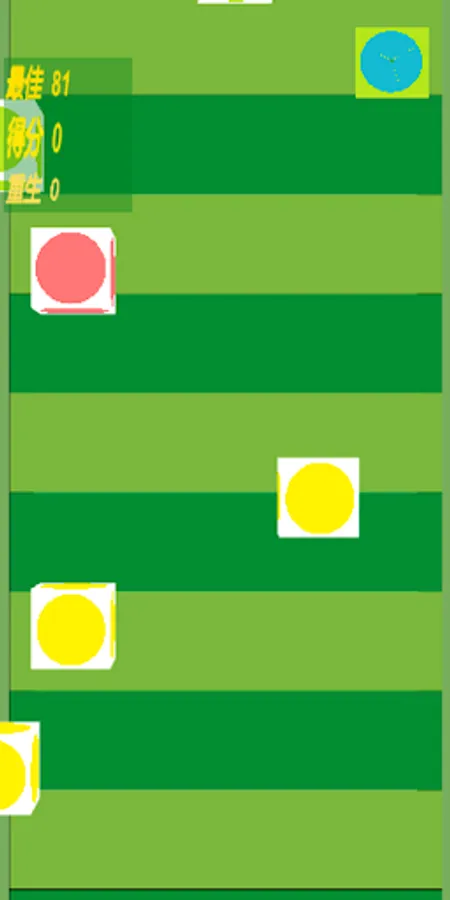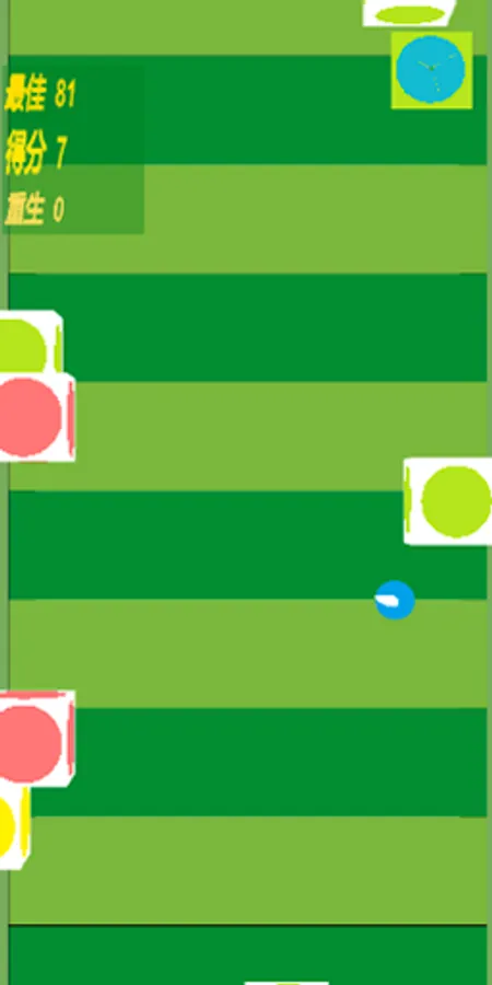 在传球大师游戏中,我们通过点击颜色不同的图案的方块,使小球移动到点击的方块内部。如果小球到达的方块的图案的颜色是绿色或黄色,则的一分。并且只要小球在视野内,就可以重复点击,但不能在拥有小球时重复点击。如果小球到达的方块的图案为红色,则游戏失败。如果小球离红色方块过近,则重生次数减1。 如果小球所在方块为黄色,并且紧贴红色方块,则很容易失败,则重生次数减1。若重生次数小于0,则游戏失败。