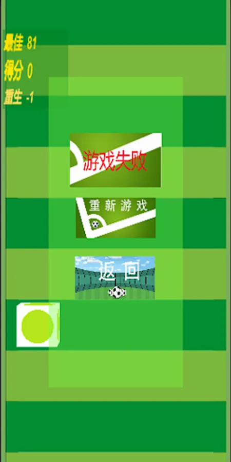 ,黄色情况下大机率变为黄色和绿色,小机率变为红色。黄色持续时间最长。当游戏失败,可以选择重新开始,或返回初始菜单。