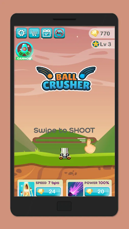 Ball crusher is simple and easy to play. Choose your cannon and get in action. Start swiping the screen left and right to move the cannon and fire. You will see giant balls coming from the top. Aim them in the line of fire and blast the balls until they explode. Bigger balls split to smaller ones when hit with the cannon bullets. Make sure you make them explode or they will crush your cannon and the game will be over. Explode all incoming balls to complete the level. Blast the balls game offers plenty of levels to keep you engaged. Complexity increase as you progress through the levels.