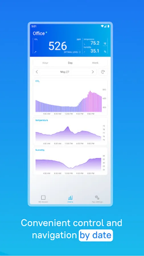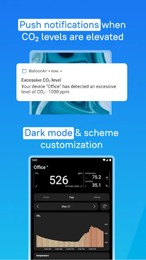 With BALLOONAIR you can control air quality levels that can affect your health, comfort and productivity, via your smartphone. Measure real time levels of CO₂, temperature and humidity. Review data history to analyze the trends of your indoor air quality. Get alerts when the CO₂ peaks to unhealthy levels.