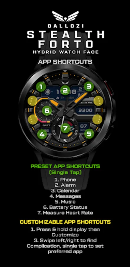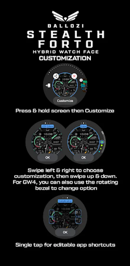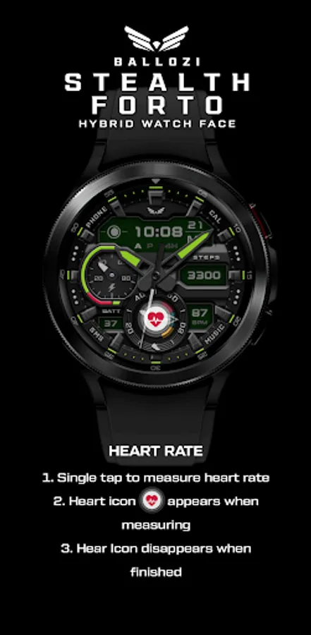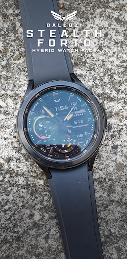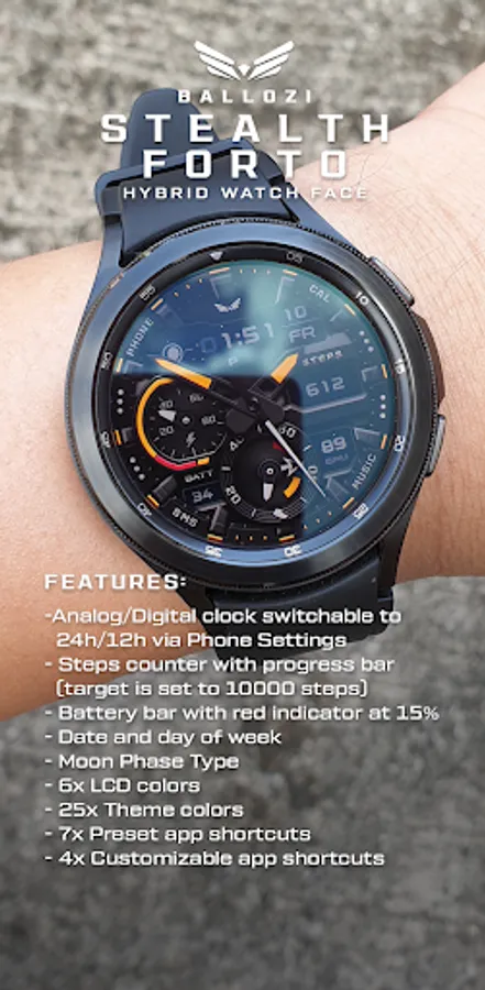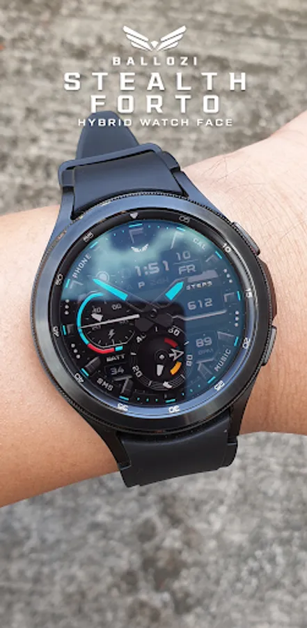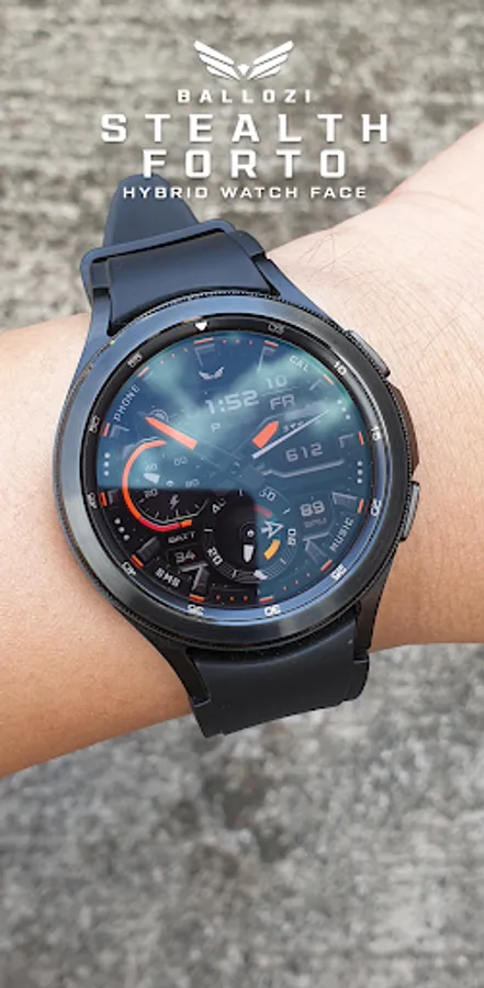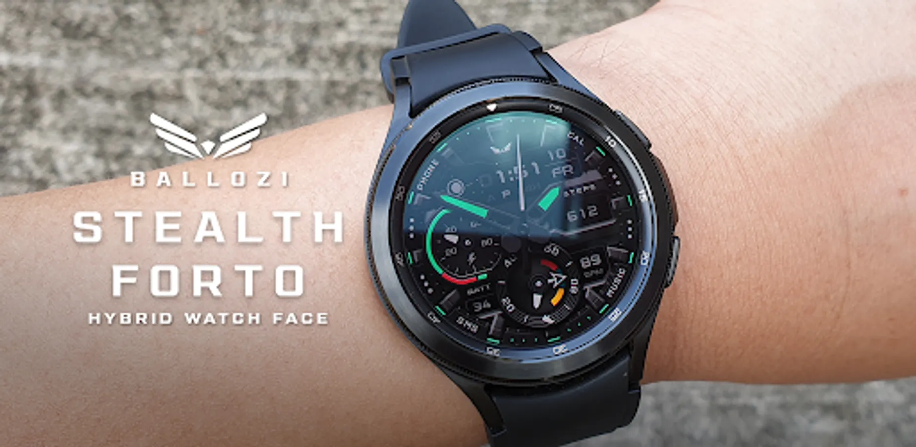 BALLOZI STEALTH FORTO is a modern, stealthy, military, sporty and masculine hybrid watch face for Wear OS. It is the stealth version of Ballozi Forto with dark LCD and gray data.