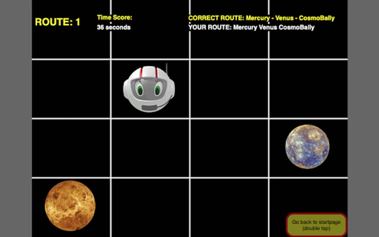 THEN (optional): Play the Bonus audio game. Find planets in a specific order along five routes to score points and connect to CosmoBally. The Bonus game uses ‘finger drag’ and ‘touch and hold’.