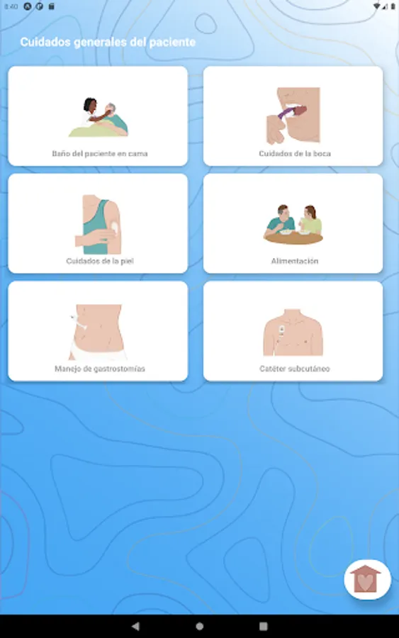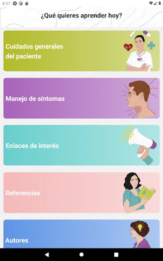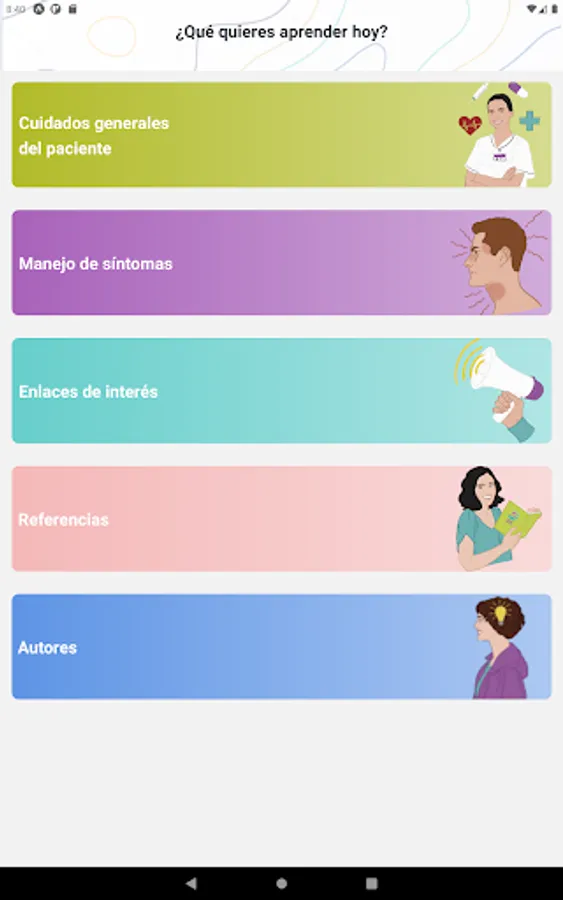 La aplicación tiene contenidos educativos sobre la definición de los cuidados paliativos, aspectos prácticos para el cuidado del paciente en la vida diaria, manejo de los principales síntomas del paciente y aspectos prácticos para el autocuidado del cuidador en su dimensión física, social, psicológica y espiritual.