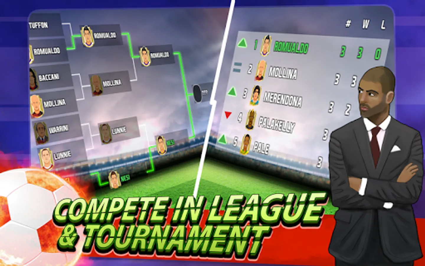 Three game modes, World, Fast Start and Training. Realistic scenario, the Tier encourages public and encourages you with their whistles and applause on the side of the pitch of the football field.