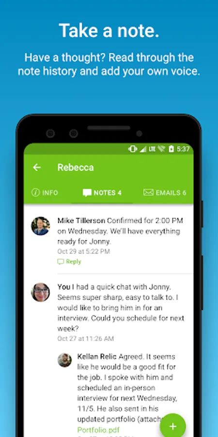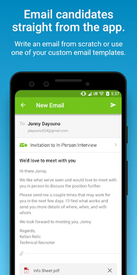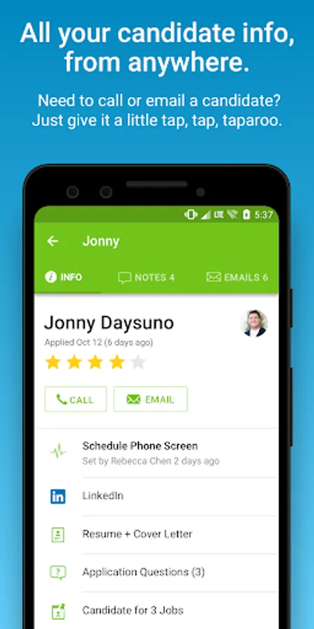 With the BambooHR Hiring app, you and your hiring team can review a candidate the instant they apply. Evaluate resumes, review answers to application questions, communicate with applicants via email, phone & text, and collaborate with hiring managers and recruiters—all from one talent acquisition app that moves at the speed of your candidates.