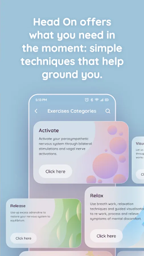 Whether you are alone or in the midst of a large group, Head On has you covered with techniques available for when you want to be discreet or practice with friends and family. Use this app to fit in with your busy schedule and fast-paced lifestyle, from breathing exercises to soothing bedtime techniques. No complex apps, analyses or mood-tracking systems. When you are experiencing a stress response, Head On offers simple and effective exercises that you need at the moment. All of which are free to use and free of ads.