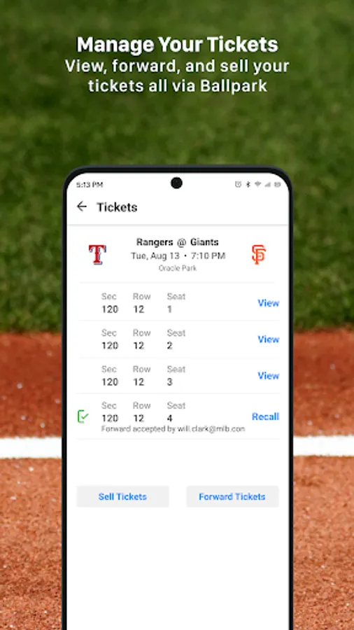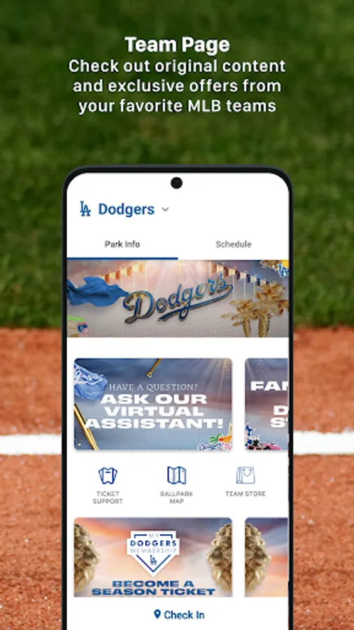 The MLB Ballpark app is your mobile companion when visiting your favorite Major League Baseball ballparks. The official MLB ballpark application perfectly complements and personalizes your trip with digital ticketing functionality, mobile check-in, offers, rewards and exclusive content. Select MLB ballparks also offer mobile food and merchandise ordering.