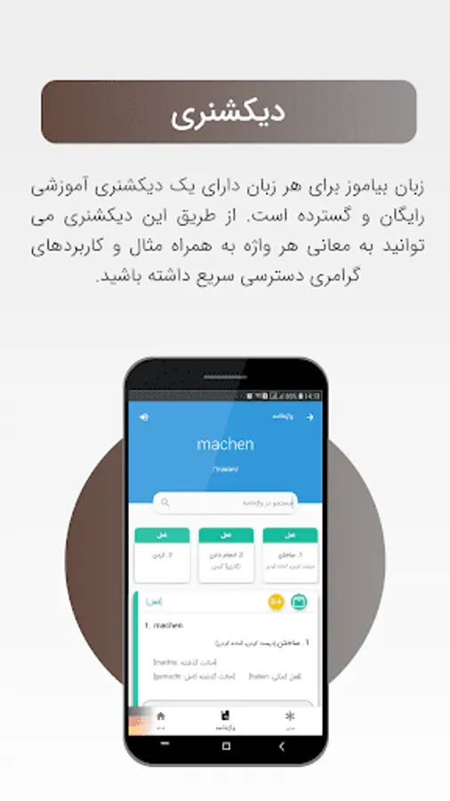 ✔ واژهنامه یا دیکشنری آفلاین داخلی برنامه: دیکشنری آموزشی بیاموز، شامل یک کتابخانه دهها هزار واژهای است که اطلاعات کاملی از هر واژه را در اختیار زبانآموز قرار میدهد. امکان استفاده آفلاین از این واژهنامه در برنامه میسر است.