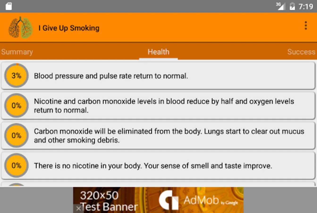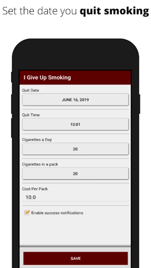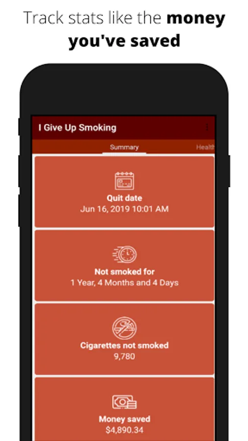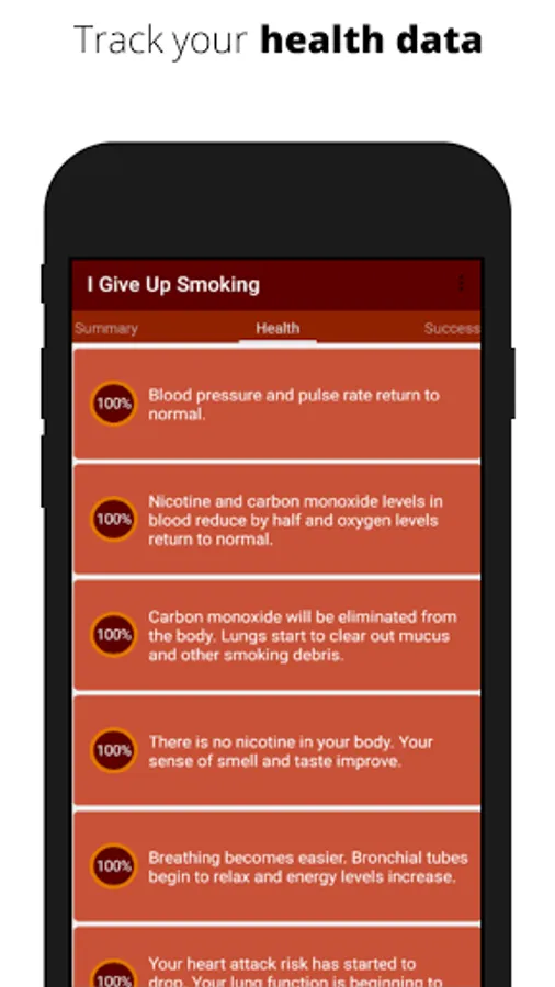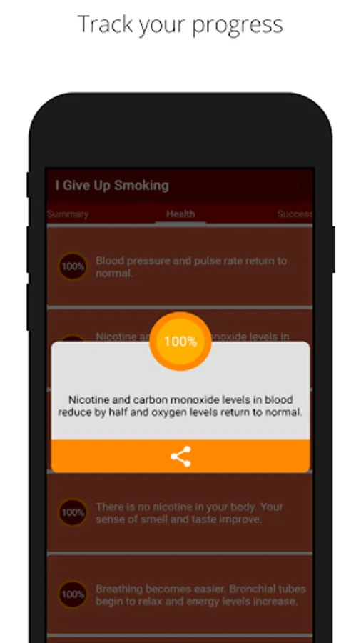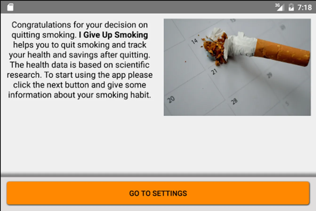 Congratulations for your decision on give up smoking. I Give Up Smoking helps you to quit smoking and track your health and money after quitting. The health data is based on scientific research. To start using the app please click the next button and give some information about your smoking habit.