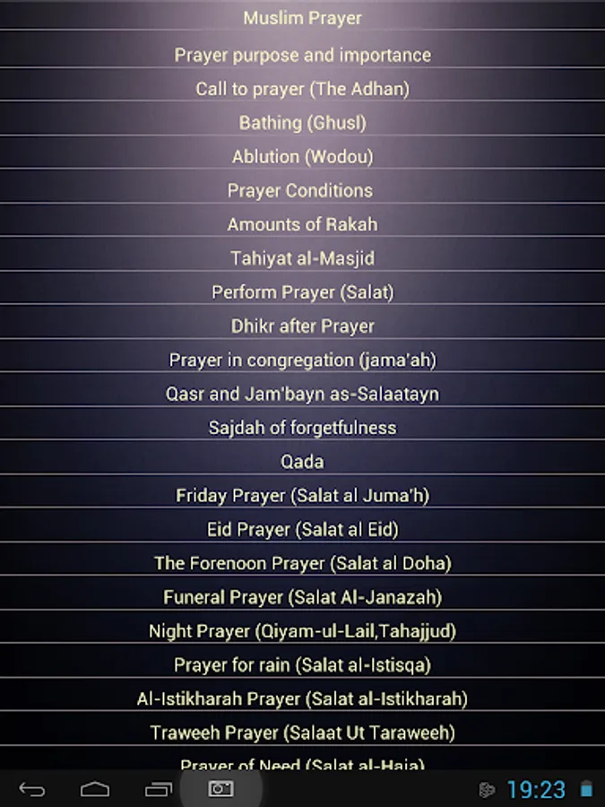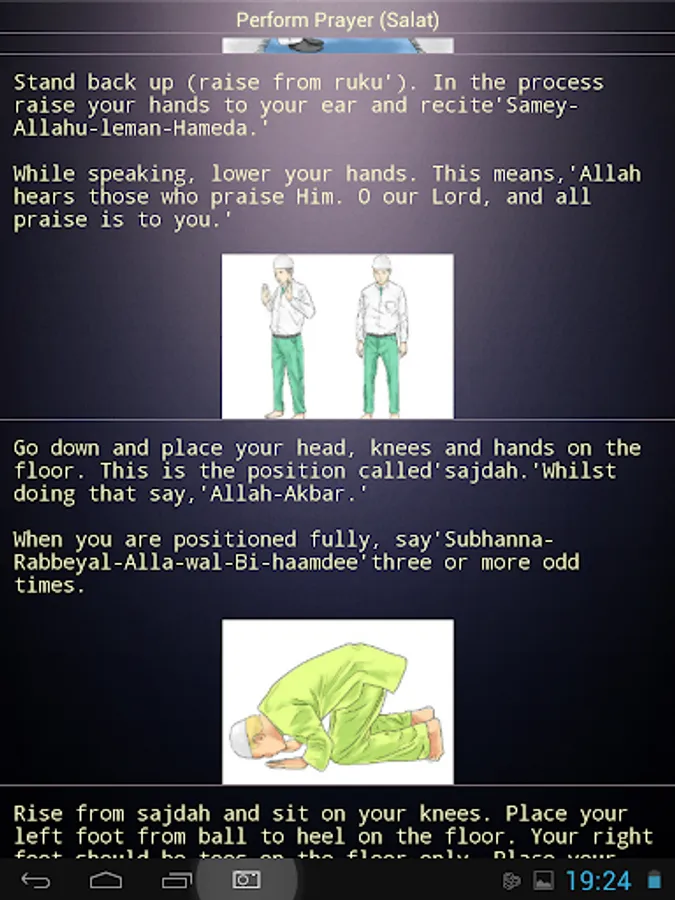 This application contains all the needed information about the Islamic prayers( Salat | Salah ) in English, in addition to each Prayer purpose and importance , its your trust-worth guidance to know the correct way of each prayer in a very clear and easy way.