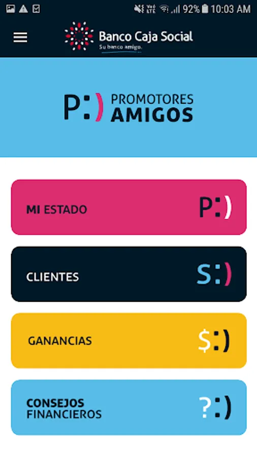 Banco Caja Social presents Promotores Amigos, an application developed for the Amiga Solution promoters to apply and become Friends Promoters. Once linked, the Promotores Amigos can use the Application to present clients, manage clients, know their profits, learn about financial advice and use the savings and credit simulators.