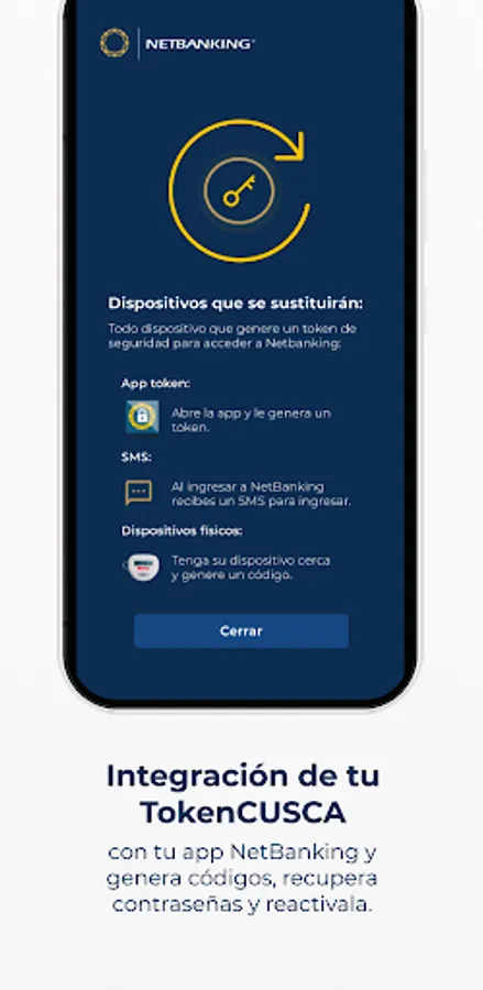 Unify the CUSCA token App with the NetBanking App in order to generate authentication codes for NetBanking web, auto-generate your password and reactivate your app, in a simpler and more comfortable way.