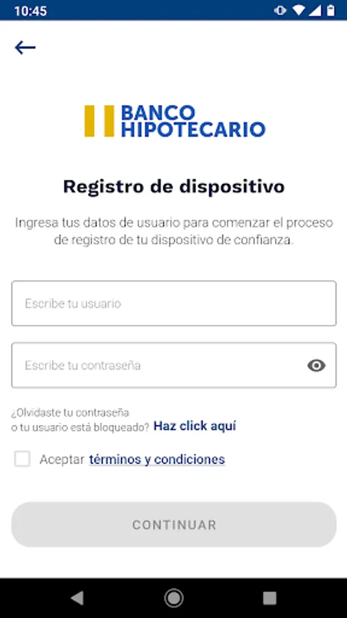 Entering the mobile APP requires an E-Banking username and password, if you do not yet have this access you can create it yourself from the E-Banking website or request it from any of our network of agencies located throughout El Salvador .
