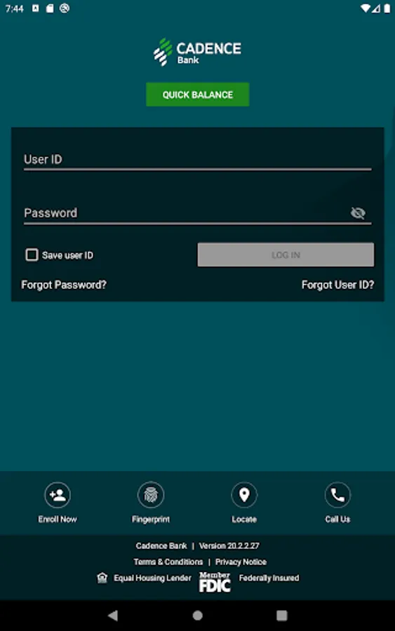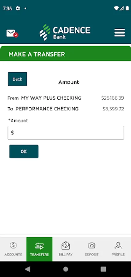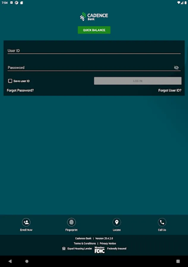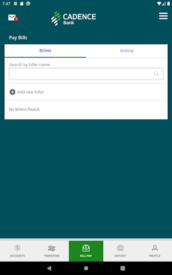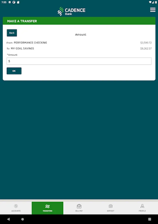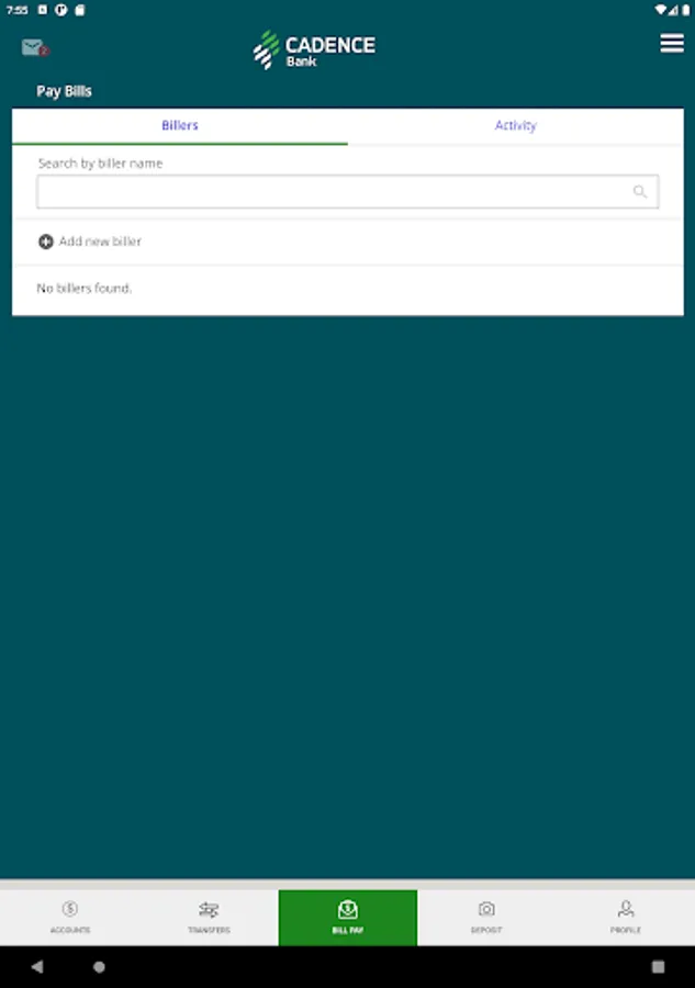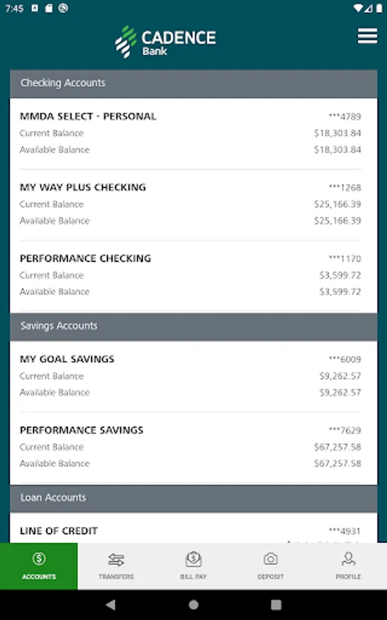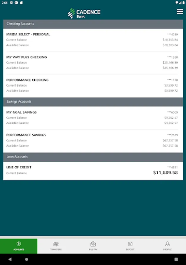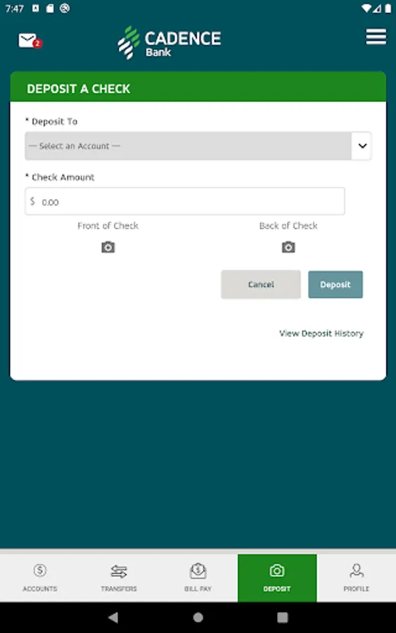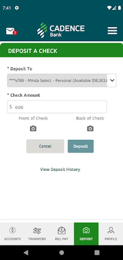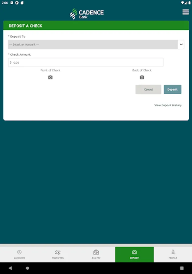 The Cadence Bank Mobile App gives you access to your accounts from your mobile device. It allows you to view account balances, view recent account activity, transfer funds, pay bills, live chat, remote deposit and find the nearest ATM or branch locations.