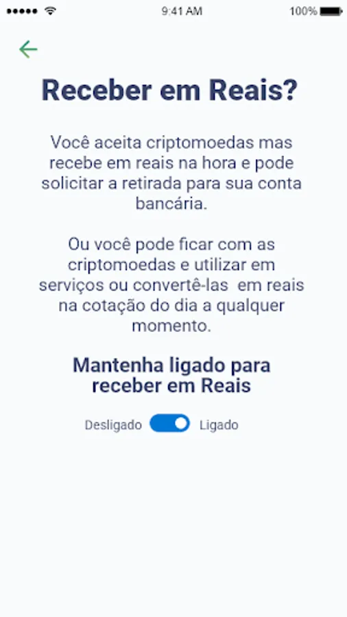 You can choose to stay with the cryptomoeda or in Brazilian Reais (BRL) and receive it in your bank account.